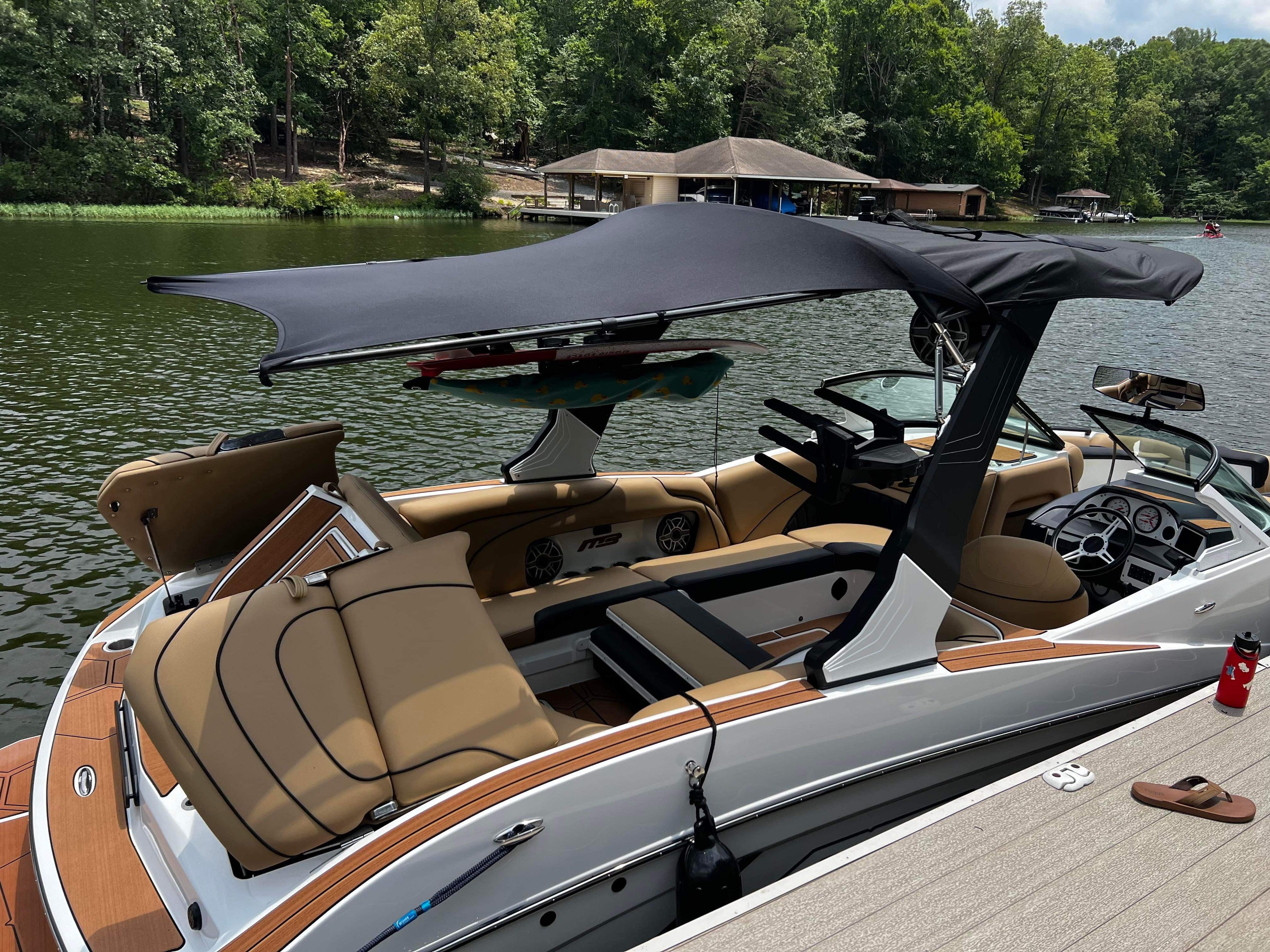 We recommend taking the shade system down while wakeboarding or waterskiing.